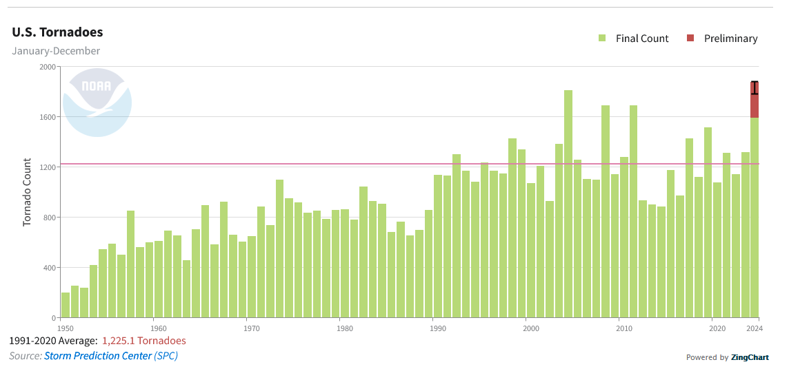 Last year (2024) turned out to be the second worst year on record for tornadoes, and it might still beat out 2004 to become #1. As you can see from the chart below, an average tornado year is now worse than the worst years of the 1980s and 1990s. It’s only up from here, I’m afraid: